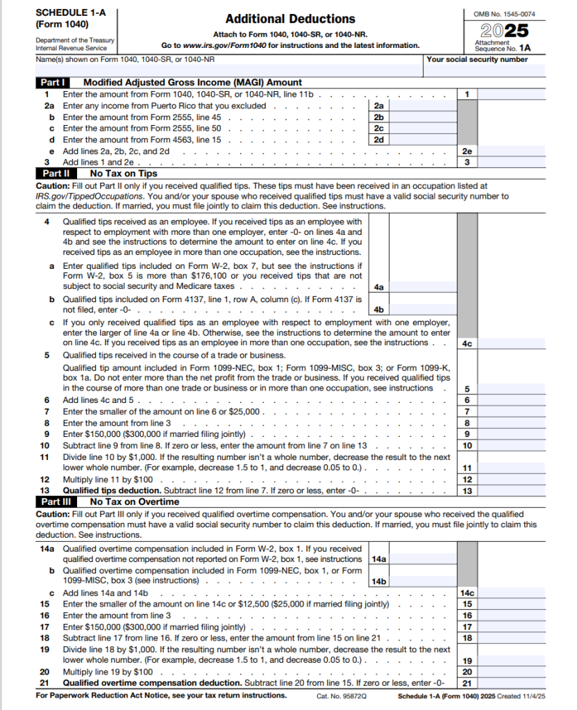 The IRS on Monday published Schedule 1-A and its related instructions (included in the Form 1040 Instructions) for tax year 2025 so eligible taxpayers can claim tax breaks on tips, overtime, and auto loans, as well as the enhanced deduction for senior citizens, introduced in the One Big Beautiful Bill Act last July.