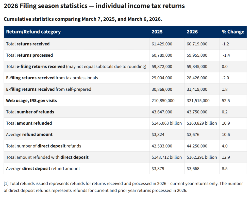 The IRS has distributed $160.8 billion in refunds, up from $145 billion in 2025. That represents an increase of 10.9% year-over-year. Those increases come despite the number of returns having been filed and processed being down by 1.2% and 1.4% respectively. This year, the IRS has received 60.7 million returns and processed 59.9 million.